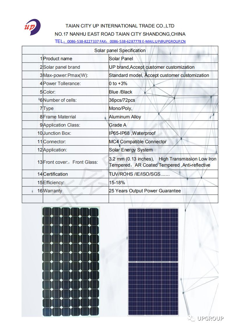 UPGROUP SOLAR PANEL PRODUCT SPECIFICATION